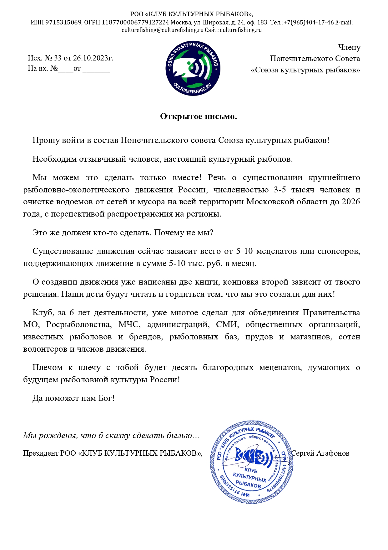 ПРЕЗИДЕНТУ "СОЮЗА КУЛЬТУРНЫХ РЫБАКОВ"
