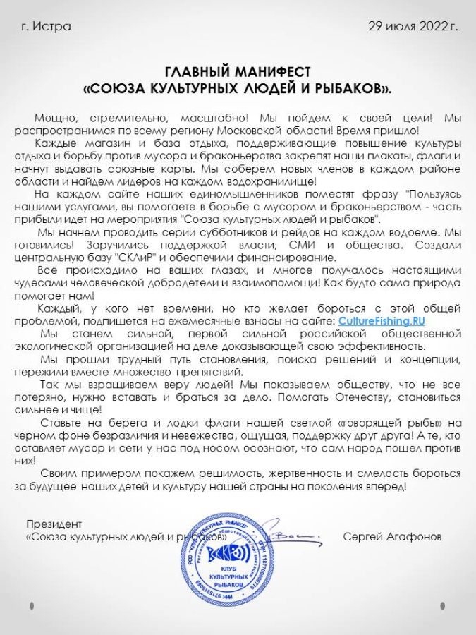 Главный манифест "Союза культурных людей и рыбаков"