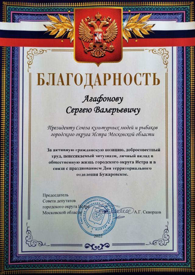 Благодарность Совета депутатов г.о. Истра Союзу культурных людей и рыбаков